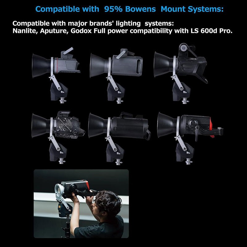 سیستم کنترل نورپردازی از راه دور Move LightGo با بیش از ۹۵ درصد نورهای LED دارای مانت بوئنز (Bowens) سازگار است، این یعنی اگر چراغهای شما مانت بوئنز دارند، میتوانید آنها را بدون خرید تجهیزات جدید روی Move LightGo نصب نمایید. این یک سرمایهگذاری هوشمندانه و مقرونبهصرفه است که از تجهیزات موجود شما پشتیبانی میکند. در عمل میتوان چراغهایی تا حدود ۵ کیلوگرم را بدون افتادگی روی آن نصب کرد، بنابراین این محصول برای مینی استروبها، نورهای LED متوسط و حتی برخی نورهای بزرگ با پاور داخلی مناسب است. نکته حائز اهمیت این است که مانت بهصورت جداشونده طراحی شده، بنابراین در آینده امکان تعویض آن با مانتهای دیگر نیز وجود دارد. این ویژگی FALCAM Move LightGo را به یک پلتفرم ماژولار و آیندهنگر تبدیل کرده است.