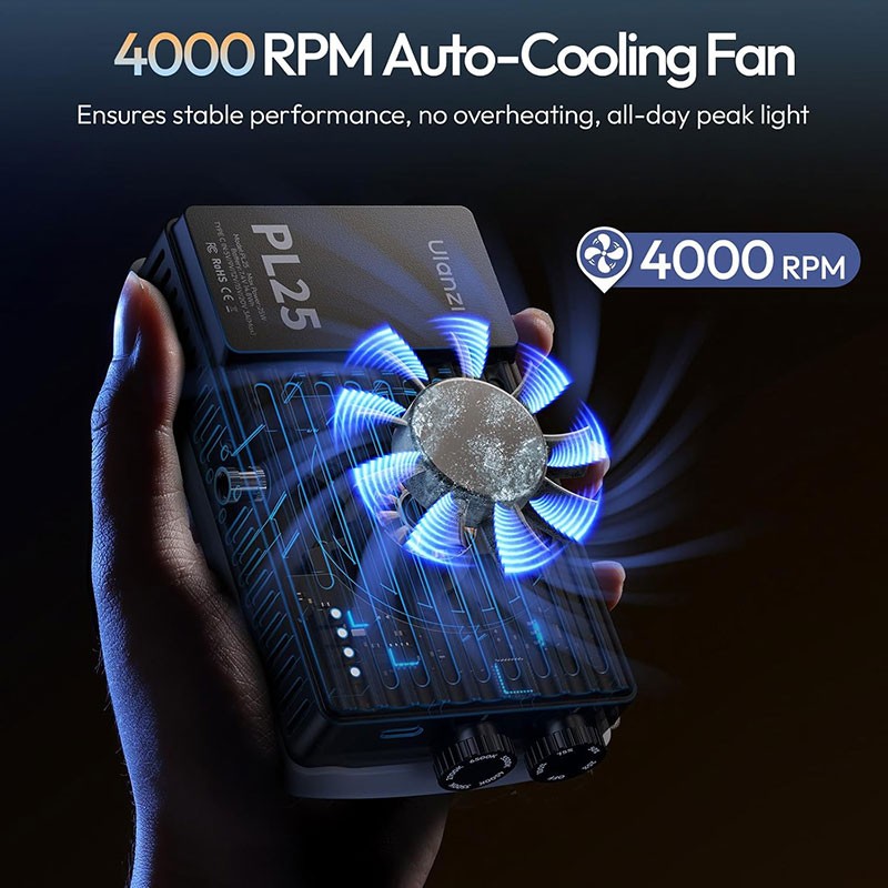 خروجی ۲۵ وات در چنین حجم کوچکی حرارت زیادی تولید میکند. بدون مدیریت صحیح، این حرارت نه تنها خطرناک است، بلکه باعث میشود چراغ برای محافظت از خود، بهطور خودکار شدت نور را کاهش دهد. راهحل اولانزی برای این مشکل، استفاده از یک سیستم خنککننده فعال (فن 4000 دور در دقیقه) است. بر خلاف بسیاری از چراغهای جیبی که به خنککاری غیرفعال متکی هستند، وجود فن در Ulanzi PL25 به آن اجازه میدهد که در حداکثر قدرت خود بهصورت پایدار و بدون کاهش نور، به کار ادامه دهد.