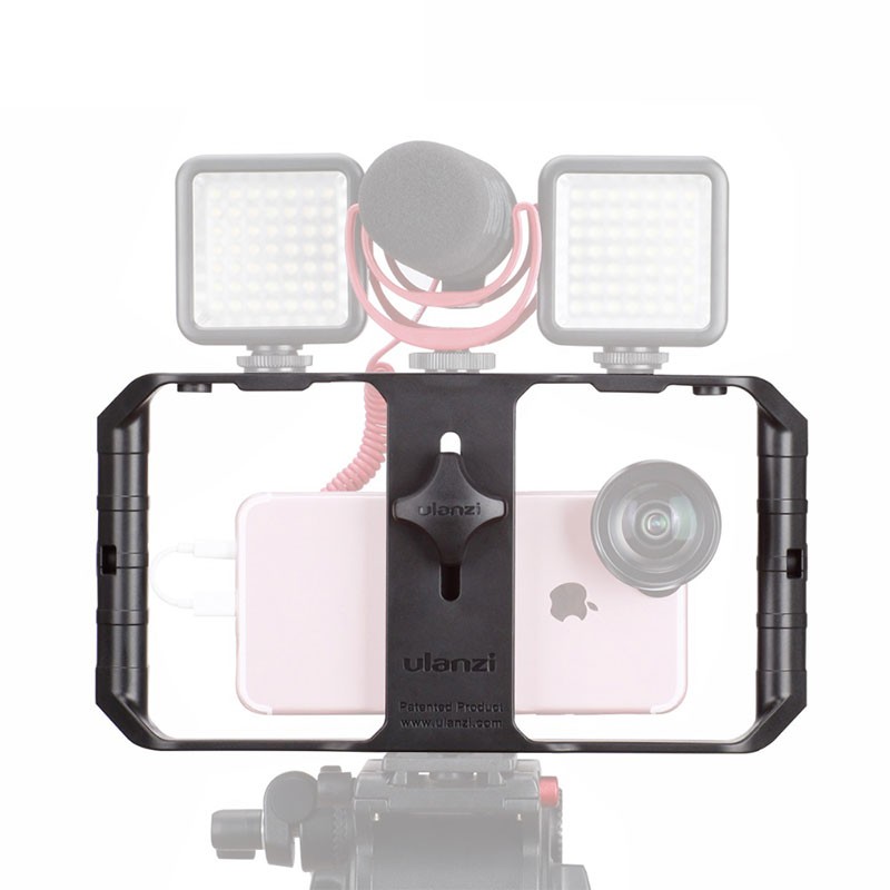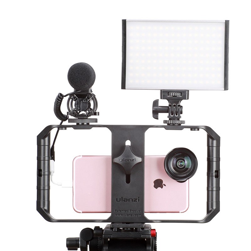 برای تولیدکنندگان محتوای حرفهای، کیفیت صوتی و نوری اهمیتی همسطح وضوح تصویر دارد. اما بهطور پیشفرض امکان نصب همزمان نور و میکروفن اکسترنال روی گوشیهای موبایل وجود ندارد. نگهدارنده موبایل U-Rig Pro این مشکل را با ارائه سه مانت کلدشو (در بالای کیج) و دو نقطه اتصال رزوهدار 4/1 اینچی استاندارد حل میکند. کلدشوها و رزوهها به شما امکان میدهند که همزمان یک میکروفن شاتگان و دو نور LED کوچک را روی این براکت فیلمبرداری (ریگ) نصب کنید. این یعنی آزادی عمل برای ساخت یک ستاپ کامل و حرفهای که در هر محیطی (از استودیو تا فضای باز) بتواند نور و صدای بهینه را فراهم کند.