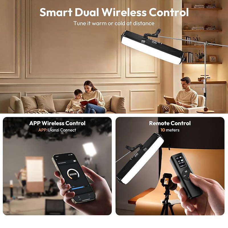 شرکت یولانزی امکان کنترل از راه دور نور بادی AL120 را به دو روش مهیا کرده است: یک ریموت جداشونده که روی دسته قرار میگیرد و یک اپلیکیشن اختصاصی به نام "Ulanzi Connect".