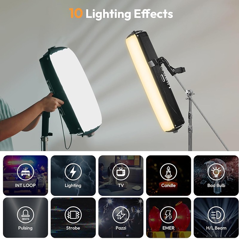 نور بادی Ulanzi AL120 دارای ۱۰ افکت نوری از پیش تنظیمشده است که شامل جلوههایی مانند رعد و برق، شمع، استروب و... میشود. این افکتها امکان افزودن جلوههای بصری خلاقانه و دراماتیک را به ویدیوها و عکسها فراهم میکنند و میتوانند برای سناریوهای خاص یا ایجاد حالوهوای منحصربهفرد مورد استفاده قرار گیرند. برای یک سازنده فیلم کوتاه، افکت رعد و برق میتواند بهسرعت و بهسادگی یک صحنه طوفانی را بدون نیاز به تجهیزات پیچیده شبیهسازی کند.